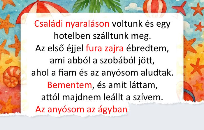 - Családi nyaraláson voltunk és egy hotelben szálltunk meg. Az első éjjel fura zajra ébredtem, ami abból a szobából jött, ahol a fiam és az anyósom aludtak. Bementem, és amit láttam, attól majdnem leállt a szívem.