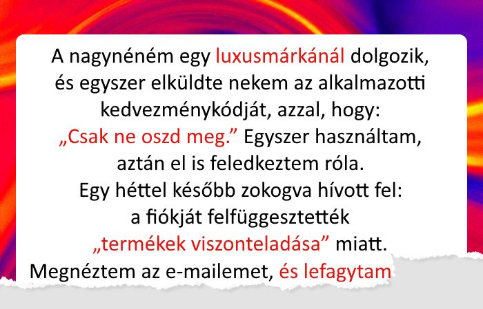 • A nagynéném egy luxusmárkának dolgozik, és egyszer küldött nekem egy alkalmazotti kedvezményes kódot. Azt kérte, ne osszam meg senkivel. Egyszer használtam, majd meg is feledkeztem róla. Egy héttel később sírva hívott fel, hogy felfüggesztették a fiókját “a termékek viszonteladása” miatt. Teljesen ledöbbentem. Az extra rendeléseket az én címemre küldték. Ekkor jöttem rá, hogy anya, aki minden este ellenőrzi a telefonomat, láthatta a kódot az üzenetek között, és felhasználta azt. A nagynéném most azt hiszi, én tettem tönkre a munkáját, és nem mondhatom el neki az igazságot, nehogy szétszakadjon a család.