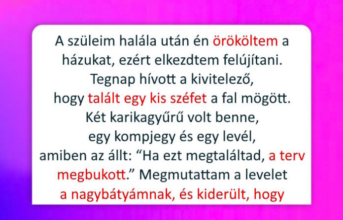 - A szüleim halála után én örököltem a házukat. Elkezdtem felújítani. Tegnap hívott a kivitelező, hogy talált egy kis széfet a konyha fala mögött. Két karikagyűrű volt benne, egy kompjegy arra a szigetre, ahova jártunk, és egy levél, amiben az állt: “Ha ezt megtaláltad, a terv megbukott.” Az alján a nagynéném aláírása állt. Összezavarodtam. Ő még sokkal a születésem előtt külföldre költözött, és a szüleim halála után megszakadt köztünk a kapcsolat. Aznap este megmutattam a levelet a nagybátyámnak, a nagynéném bátyjának. Elcsendesedett, majd elmondta az igazságot. A születésem előtt anya és a nagynéném vállalkozásba akartak fogni azon a szigeten. A két gyűrű ezt az egymásnak tett ígéretet szimbolizálta, nem házasságot.