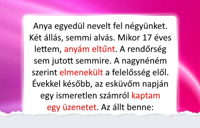 Anya nagyon aggódott, mert apa már régóta távol volt, ezért nagyon boldog volt, mikor végre hazaért. Mikor elmesélték nekem, nagyon meghatódtam. Mennyire szép dolog ez már? © QuirkyMaterial / Reddit - Anya egyedül nevelt fel négyünket. Két állás, semmi alvás. Mikor 17 éves lettem, anyám eltűnt. A rendőrség sem jutott semmire. A nagynéném szerint elmenekült a felelősség elől. Évekkel később, az esküvőm napján egy ismeretlen számról kaptam egy üzenetet. Az állt benne: “Nagyon örülök neked, drága kislányom! Most már igazi felnőtt lettél. Hiányzol. Hamarosan beszélünk.” Rögtön megpróbáltam felhívni a számot. Egy férfi vette fel, és mondta, hogy anyám nála van.