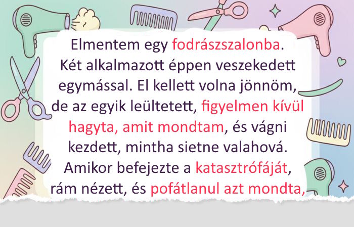 Aztán letette. Igazából 5 másodperc alatt megoldotta a gondunkat. © MonsieurRud / Reddit - Elmentem egy fodrászszalonba. Két alkalmazott éppen veszekedett egymással. El kellett volna jönnöm, de az egyikük észrevett és odavitt az egyik székhez. Próbáltam elmagyarázni neki, mit szeretnék. De ő csak fogta az ollót és elkezdte vágni a hajamat. Mikor megkérdezte, vizezze-e be, egyszer ráspriccelt, majd folytatta a vágást. Próbáltam beszélgetni vele, de nem foglalkozott velem.