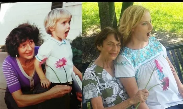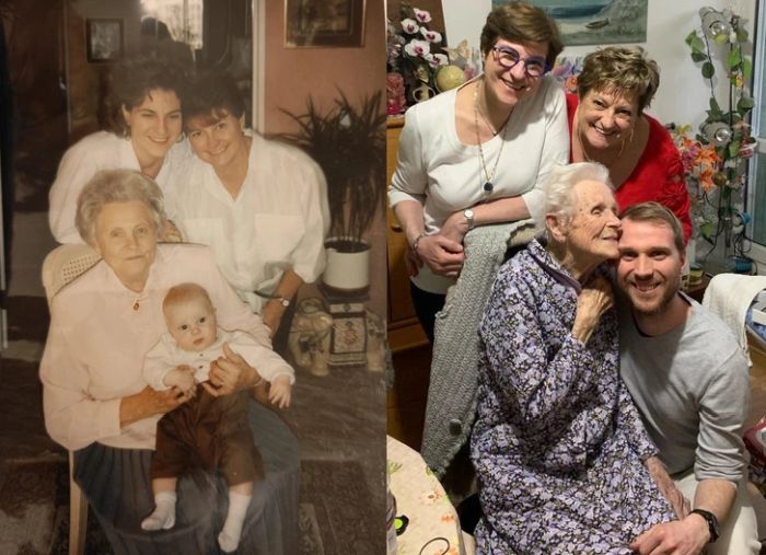 6. “A dédanyám, a nagymamám, anya és én. 28 év telt el a két kép között. (1995 és 2024)”