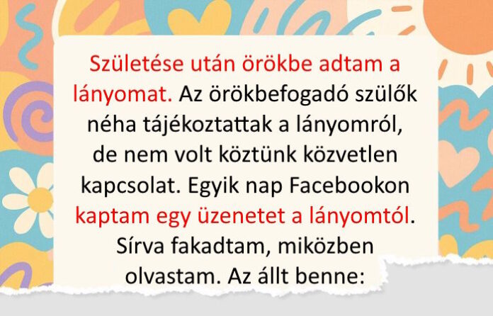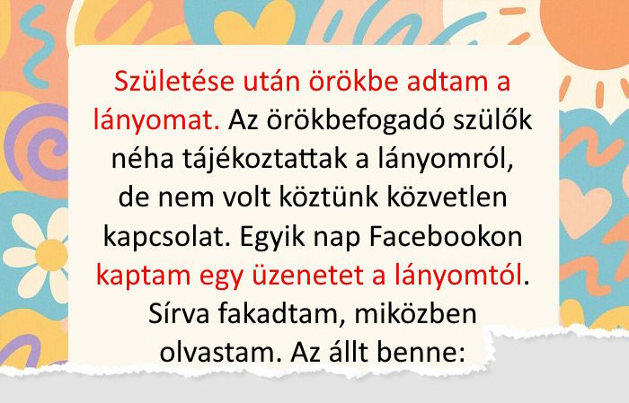 - Születése után örökbe adtam a lányomat. Az örökbefogadó szülők néha tájékoztattak a lányomról, de nem volt köztünk közvetlen kapcsolat. Egyik nap Facebookon kaptam egy üzenetet a lányomtól. Sírva fakadtam, miközben olvastam. Az állt benne: “Miért adtál oda?” Válaszoltam neki, leírtam, hogy nem arról volt szó, hogy nem akartam őt. Elmagyaráztam, hogy túl fiatal voltam, nem volt pénzem, egyedül voltam, és úgy gondoltam, normális életet érdemel. Olyat, amit én akkor nem tudtam megadni neki. Elkezdtem beszélgetni. Kérdezett az életemről, az emlékeimről, a hibáimról. Mondta, hogy hamarosan betölti a 18-at. Nem számítottam semmire, de meghívott a szülinapi bulijára, ahol a szülei is ott voltak. Könnybe lábad a szemem, mikor erre gondolok.