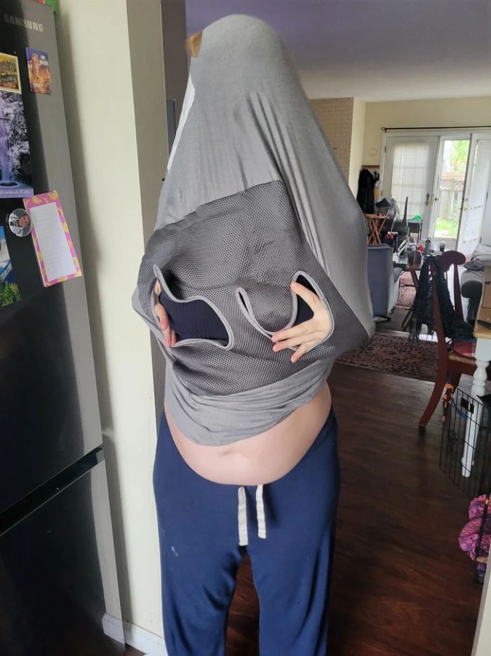 4. “Ez valami szoptatással kapcsolatos dolog? Első babámat várom, és valaki ezt adta nekem, és csak annyit mondott, hogy ‘ez valami szoptatós… izé’. Másodkézből szerezte. Nagyon zavarban vagyok, mert ez tulajdonképpen egy zsák, amelyben lyukak vannak a melleknek. Hova kell tenni a babát? Hogyan kell felvenni?”