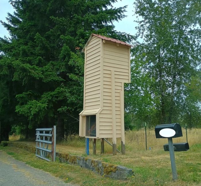 11. “Az út szélén láttuk Oregonban, egy kocsifelhajtó végén. Az alsó, üveges része a kocsifelhajtó felé néz, kb. 4,5 m magas. A feleségemet halálra rémíti mindig, mikor erre vezet, mert nem tudja, mi ez. Belül üresnek tűnik. Megfigyelőtorony? Madárház? Szarvasetető?”
