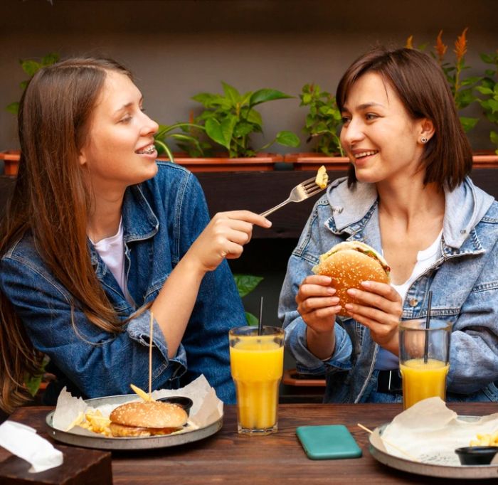 - A vegetáriánus barátom elvitt hamburgerezni. Egy csirkeburgert és egy vegetáriánus burgert rendelt. De a pincér fordítva tette le elénk őket.