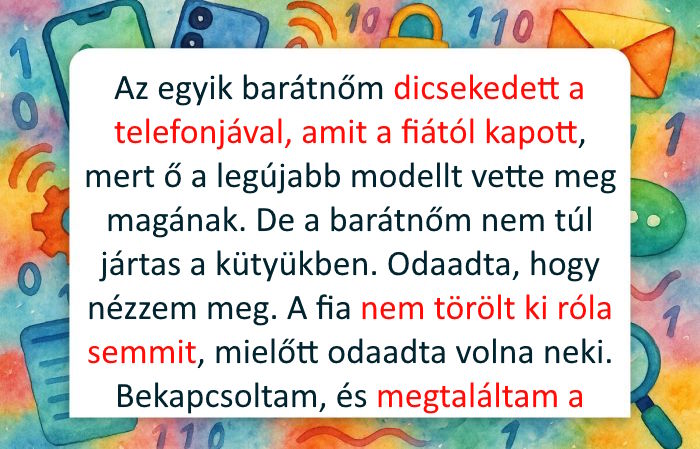 - Az egyik barátnőm dicsekedett a telefonjával, amit a fiától kapott, mert ő a legújabb modellt vette meg magának. De a barátnőm nem túl jártas a kütyükben. Odaadta, hogy nézzem meg. A fia nem törölt ki róla semmit, mielőtt odaadta volna neki. Bekapcsoltam, és romantikus üzeneteket találtam egy nővel, miközben a fiú évek óta házas. Most nem tudom, szóljak-e erről a barátnőmnek vagy se. De nem töröltem ki semmit, hagyom, hogy maga találjon rá, és majd eldönti, mihez kezd. © Helena Z / Dzen