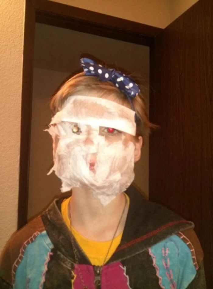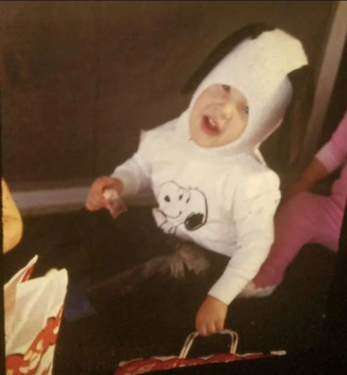 5. “A szüleim nem engedhették meg maguknak, hogy farsangi jelmezt vegyenek nekem, ezért összervarrtak két zoknit, és készítettek belőle egy símaszkot. Így lett belőlem Snoopy.”