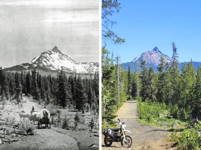 11. “Megpróbáltam megkeresni ugyanazt a helyszínt Oregonban. Az első fotó dátuma ismeretlen, a második 2020-ban készült. Ezt az utat 1860-tól az 1930-as évekig használták.”