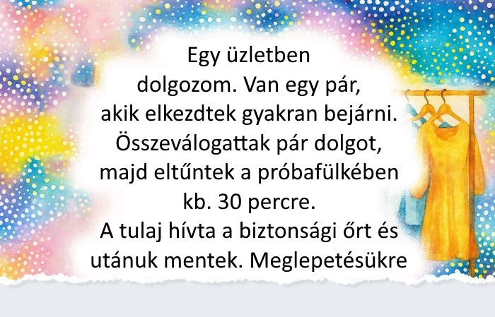 Egy nő a lányával jött vissza a próbafülkébe. A lány bement abba a fülkébe, ahol az összes ruhát találtam, és egy nadrágot keresett. Az anyja megkérdezte tőlem, hol a nadrág. Akkor jöttem rá, hogy ők hagyták ott a kupac ruhát. Odaadtam neki a nadrágot, mire azt mondta: “Elnézést, csak közben elmentünk nézelődni, azt hittük, addig senki nem fog bemenni a fülkébe.” Hogy mi?!