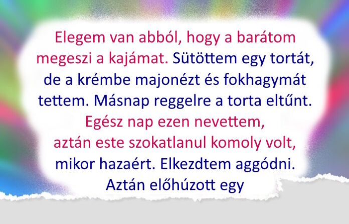 • Elegem van abból, hogy a barátom megeszi a kajámat. Sütöttem egy tortát, de a krémbe majonézt és fokhagymát tettem. Másnap reggelre a torta eltűnt. Egész nap ezen nevettem, aztán este szokatlanul komoly volt, mikor hazaért. Elkezdtem aggódni.