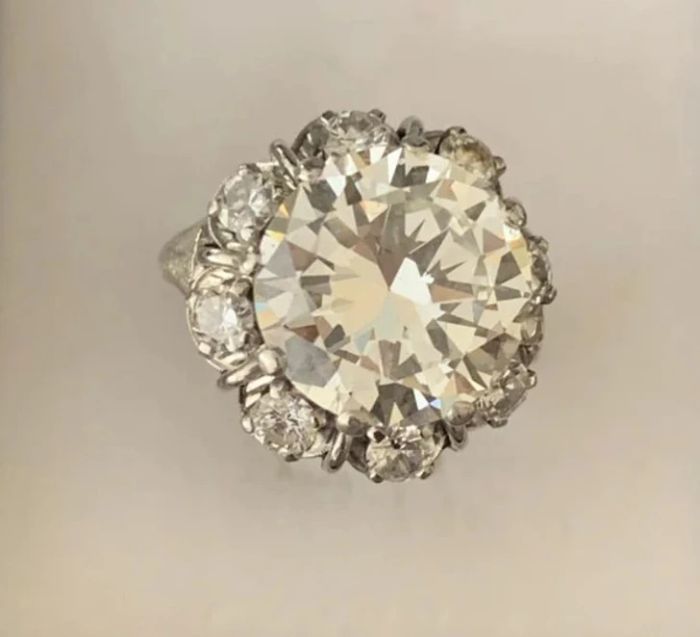 “Anya kis titka. 6 karátos gyémánt, körülvéve 8 további, fél karátos gyémánttal. Platina foglalattal. 1970 körül készült.”