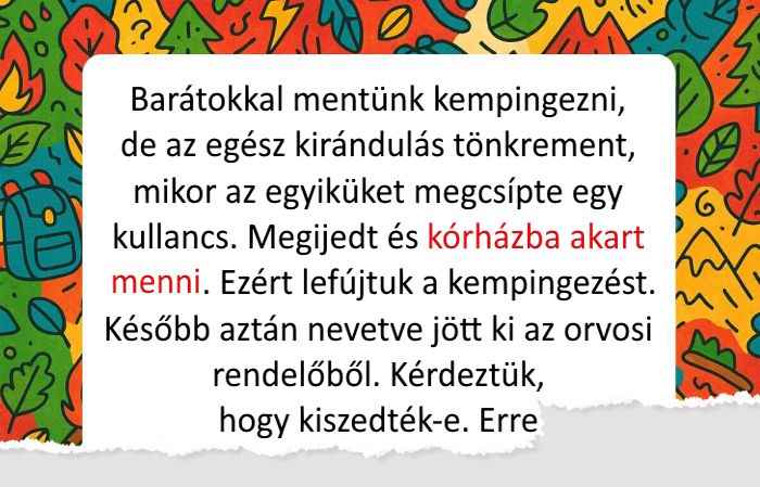 Később elmeséltem a barátaimnak, és ezen nevettek a következő 3 napban. © Not everyone will understand / VK - Barátokkal mentünk kempingezni, de az egész kirándulás tönkrement, mikor az egyiküket megcsípte egy kullancs. Megijedt és kórházba akart menni. Megpróbáltuk kiszedni kullancsot, de nem engedte, mivel az intim részén volt. Ezért lefújtuk a kempingezést.