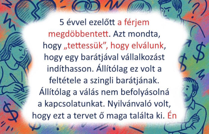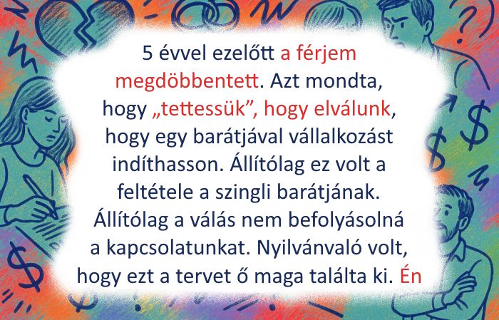 Ennek már 5 éve, és nem megy valami jól. De nem vagyok dühös, mert óriási teher ment le rólam, hogy megszabadultam egy ilyen értéktelen férfitól. Ha soha nem is fogom megtalálni a hercegemet, akkor sem fogom bánni. © Overheard / Ideer - 5 évvel ezelőtt a férjem megdöbbentett. Azt mondta, hogy “tettessük”, hogy elválunk, hogy egy barátjával vállalkozást indíthasson. Állítólag ez volt a feltétele a szingli barátjának.Állítólag a válás nem befolyásolná a kapcsolatunkat. Nyilvánvaló volt, hogy ezt a tervet ő maga találta ki. Ahelyett, hogy botrányt csináltam volna, elfogadtam a válást. Továbbra is együtt éltünk és neveltük a gyerekeket.Karriert építettem, vettem egy autót és egy házat. Most fejezem be a felújítást, és hamarosan beköltözöm oda a gyerekekkel. A látszatférj nem tud róla.Az üzletük alig hoz bevételt. Örülnöm kellene, de a harag még mindig nyomaszt. © Overheard / Ideer