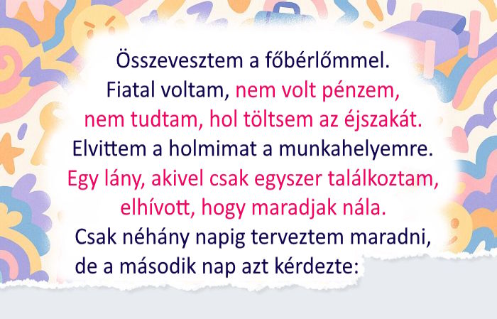 - Egyszer csúnyán összevesztem a főbérlőmmel. Egy hete fizettem ki a lakbért, fiatal voltam, nem volt pénzem új lakást kibérelni. Nem tudtam, hol töltsem az éjszakát. Elvittem a holmimat a munkahelyemre. Nem tudtam, mit tegyek. Egy lány, akivel csak egyszer találkoztam, elhívott, hogy maradjak nála. Csak néhány napig terveztem maradni, de a második nap azt kérdezte: “A többi cuccodat mikor hozod át?” Kiderült, hogy azt akarja, hogy nála lakjak. Most ő az egyik legjobb barátnőm. © _svetochey