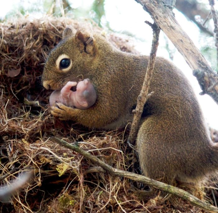 6. A mókus mama gondoskodik a kicsinyéről.