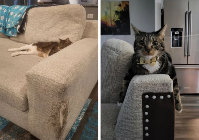 10. “A macskánk lekaparta a kanapé szélét. Így oldottam meg a problémát. Nagyon elégedett vagyok az eredménnyel.”