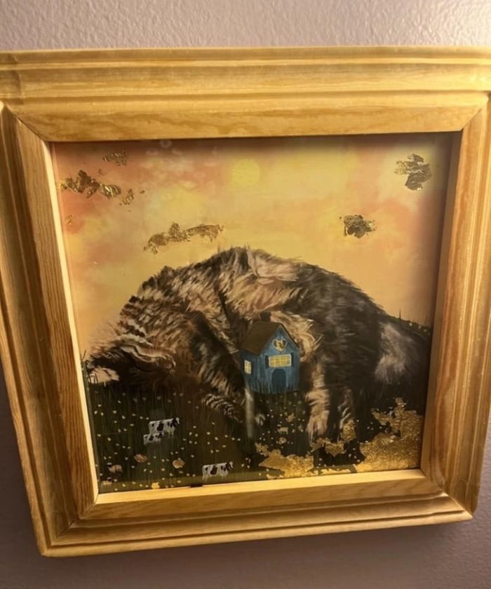 15. “A kutya szétrágta a képet, ezért a harapásnyomokat aranyfóliával takartam el, a férjem pedig elkészítette a keretet.”