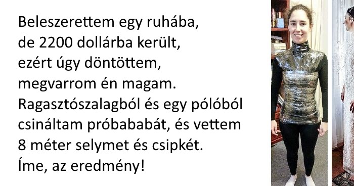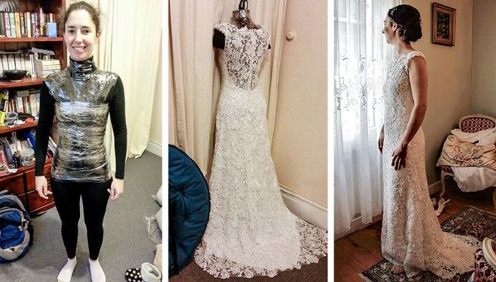 3. “Beleszerettem egy ruhába, de 2200 dollárba került, ezért úgy döntöttem, megvarrom én magam. Ragasztószalagból és egy pólóból csináltam próbababát, és vettem 8 méter selymet és csipkét. Íme, az eredmény!”