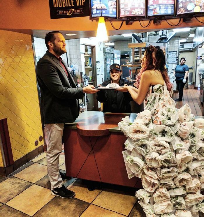 2. “Mindketten imádjuk a gyorséttermeket, ezért a ruhámat burrito csomagolásokból kreáltam.”
