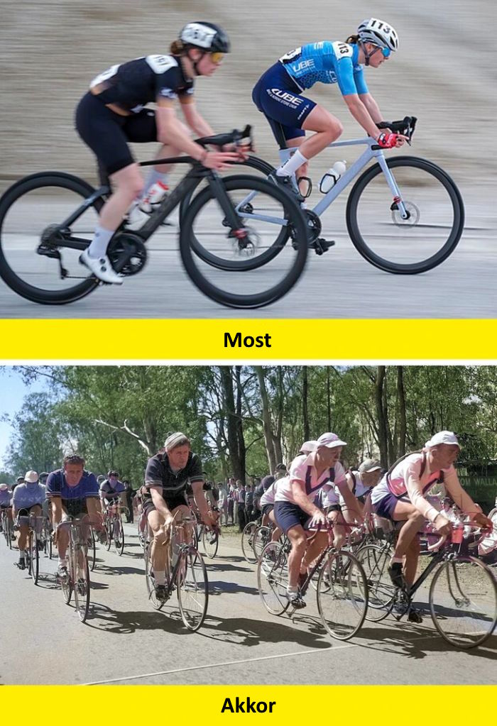 Most: A modern kerékpárosok speciális ruhát és kúp alakú sisakot viselnek a nagyobb védelem érdekében, és hogy gyorsabban tudjanak mozogni a légellenállás csökkentése révén. A kerékpárok szénszállal készülnek, egyes versenyzők pedig disc kerekeket használnak, melyek vitorlaként szelik a levegőt.