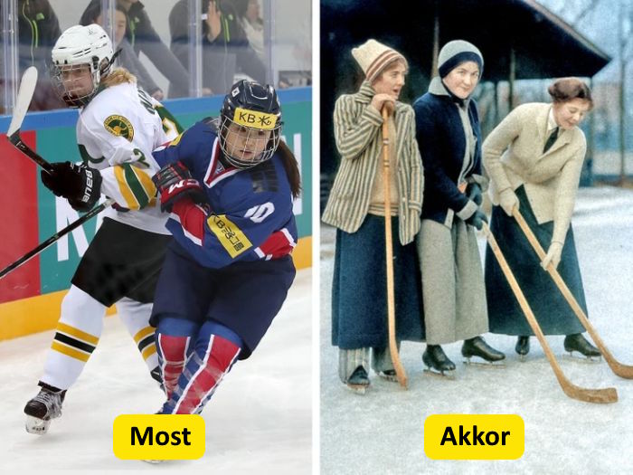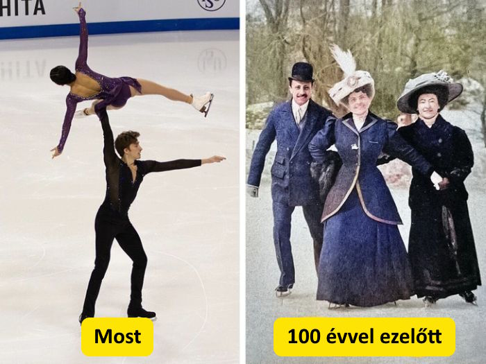 Akkor: Az első korcsolyákat a téli közlekedéshez használták, nem ugrásokhoz és forgásokhoz. A versenyeket szabadtéren rendezték, a férfiak öltönyben, a nők hosszú szoknyákban korcsolyáztak. A korcsolyákhoz magasszárú csizma tartozott.