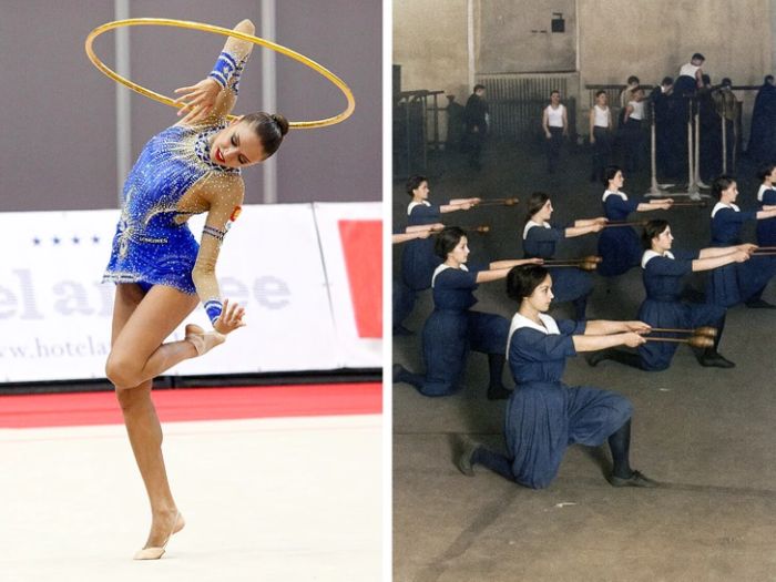 Akkor: A ritmikus sportgimnasztika a 20. század elején jelent meg, és kezdetben a mozgás kecsességét, rugalmasságát és kifejezőképességét hangsúlyozta. Eleinte a női tornászok köteleket, karikákat és labdákat használtak. A ruháik visszafogottak, sokszor egyszínűek voltak, hogy az elegáns mozgás nagyobb hangsúlyt kapjon.