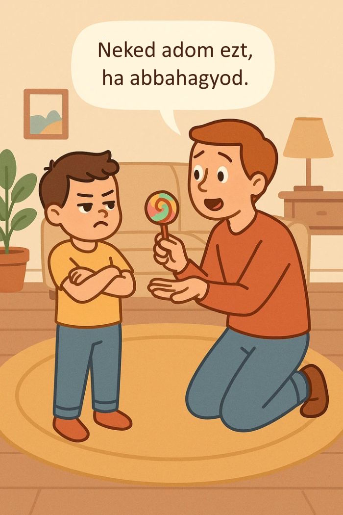 Ezzel aláásod a fegyelmezés tekintélyét, és olyan ördögi kört teremtesz, ahol a gyerek elvárja a jutalmazást a jó viselkedésért, nem pedig tiszteletből és fegyelmezettségből fog jól viselkedni. Ahelyett, hogy belemennél ebbe az alkudozásba, állíts fel egyértelmű határokat, és tanítsd meg neki, hogy a tetteinek következményei vannak.