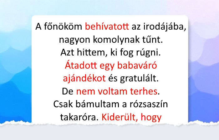- A főnököm behívatott az irodájába, nagyon komolynak tűnt. Azt hittem, ki fog rúgni. Átadott egy babaváró ajándékot és gratulált. De nem voltam terhes. Csak bámultam a rózsaszín takaróra. Kiderült, hogy összetévesztett egy másik munkatársammal, akivel ugyanaz a vezetéknevünk és akkor készült szülési szabadságra menni. Mindketten nevettünk, de másnap kaptam tőle egy bocsánatkérő e-mailt azzal a címzéssel: “A nem terhesnek”.