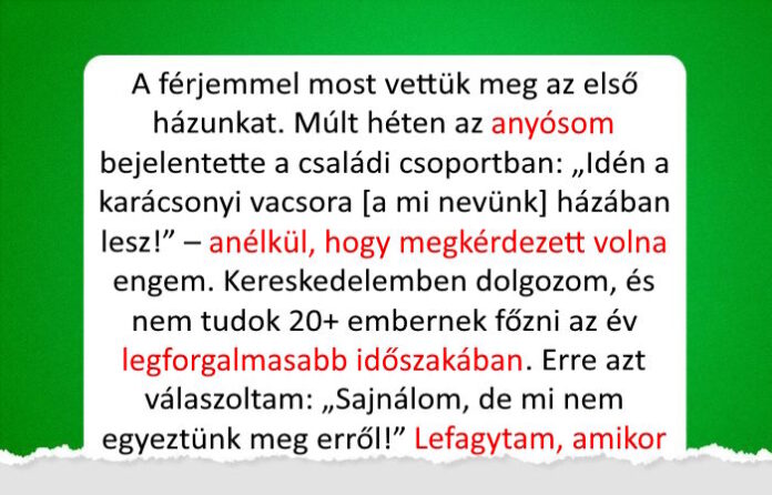Múlt héten az anyósom a családi chatben bejelentette: “Idén a karácsonyi vacsora [a mi nevünk] házában lesz!” Meg sem kérdezett erről, csak bejelentette. A kereskedelemben dolgozom, az ünnepek az év legforgalmasabb és legstresszesebb időszaka. Már az is kimerítő, hogy csak belegondolok, hogy munka után még több mint 20 emberre kell főznöm.