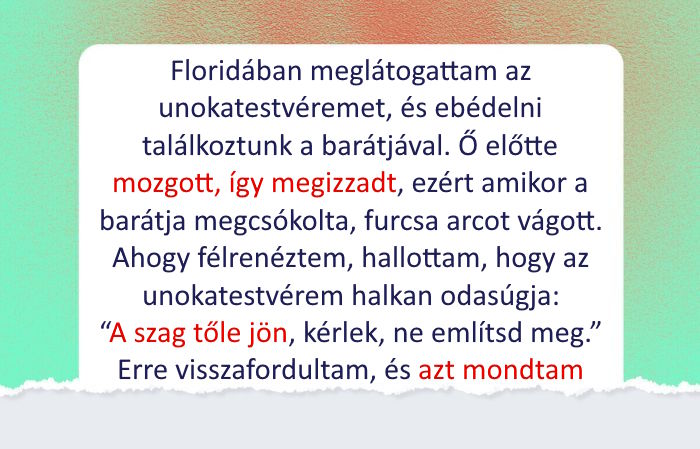 Mikor félrenéztem, az unokatestvérem megpróbált súgni valamit a barátjának, de meghallottam. “A szag belőle jön. Légyszi, ne szólj semmit.” Mondtam, hogy ez nem az én szagom. Erre a barátja odadugta az orrát az unokatestvéremhez, és megszaglászta. Megcsókolta, és azt mondta, emberi dolog, hogy egy ilyen gyönyörű nő büdös. Az unokatestvérem kínosan nevetett. Hazafelé azt mondta nekem, hogy nem kellett volna ilyen kínos helyzetbe hoznom a párja előtt. Szerinte megszegtem a lányok közti íratlan szabályokat.