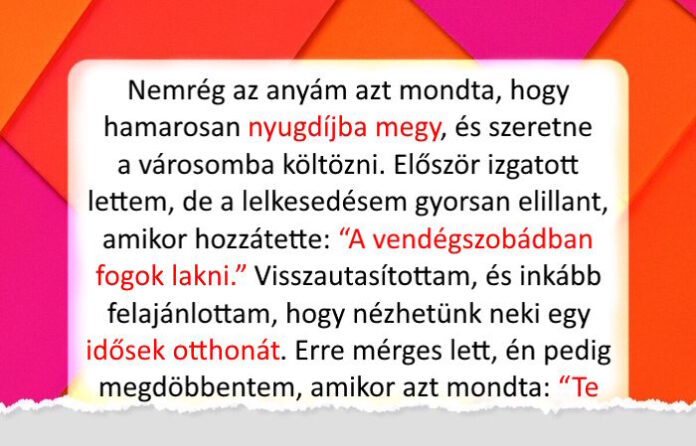32 éves nő vagyok, tavaly vettem egy 2 hálószobás házat, ami teljesen megfelel az igényeimnek. A 60 éves anyám most ment nyugdíjba és hozzám akar költözni, hogy a gyerekkori otthonomból eljöjjön a városba, ahol élek.