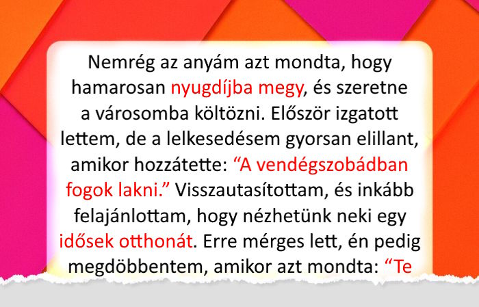 “Nemet mondtam anyámnak, hogy nyugdíjba vonulása után hozzám költözzön, most az egész család haragszik rám.”